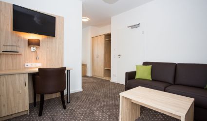 Das Doppelzimmer Komfort ist ausgestattet mit Dusche/ WC, Fön, SAT-TV, Zimmersafe, Kühlschrank, kostenlosem W-LAN, Telefon und Balkon sowie mit einem gemütlichen Wohnbereich mit Couch. Alle Matratzen haben ein Maß von 90x200cm.